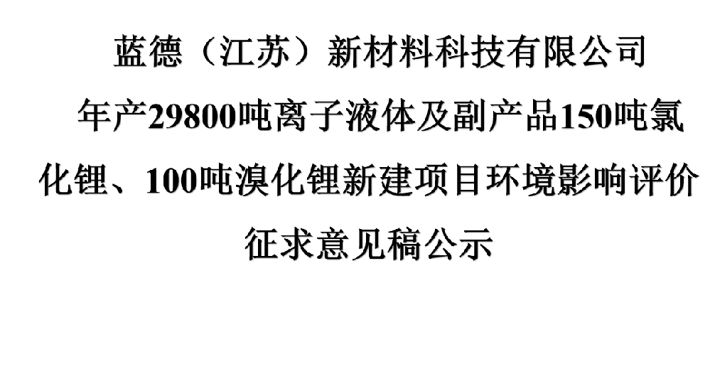 藍德(江蘇)新材料科技有限公司 年產29800噸離子液體及副產品150噸氯化鋰、100噸溴化鋰新建項目環(huán)境影響評價征求意見稿公示